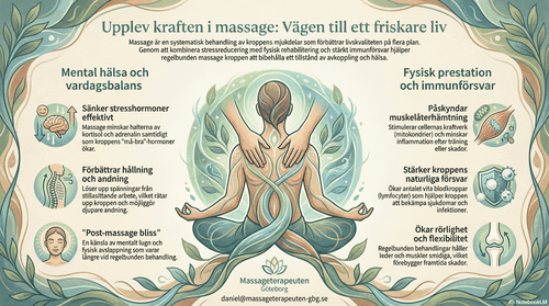 Massage hjälper till att hantera detta genom att utlösa reaktioner i hjärnan som resulterar i varaktig avslappning, mental vakenhet och förbättrat humör. Under en massage ökar kroppen sin produktion av endorfiner, serotonin och dopamin, vilket gör både kronisk och akut stress lättare att övervinna. Samtidigt minskar stresshormonerna kortisol och adrenalin, vilket låter kroppen gå in i ett återhämtningsläge.