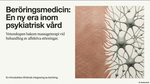 Källan förespråkar etablerandet av "beröringsmedicin" som en ny klinisk disciplin för att behandla affektiva tillstånd som depression och ångest. Genom att stimulera kroppens C-taktila nervfibrer kan massage aktivera hjärnans system för social anknytning och välbefinnande på ett sätt som liknar psykoterapi. Forskningen betonar att oxytocinfrisättning och förbättrad kroppskännedom spelar avgörande roller i de positiva effekterna vid psykisk ohälsa. Texten understryker att professionell beröring fungerar som ett kraftfullt icke-farmakologiskt verktyg genom hela livet, från spädbarnsvård till palliativ vård. Denna holistiska metod föreslås därför fungera som ett viktigt komplement till traditionella medicinska behandlingar för att stärka den mentala hälsan.